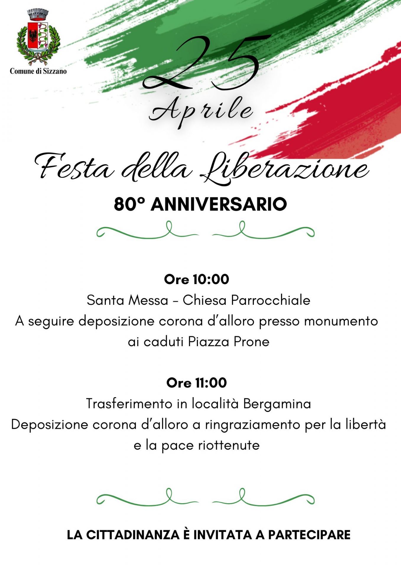 Il Comune di Sizzano invita la cittadinanza a partecipare alla ricorrenza con l'intento di tener viva la memoria delle tante persone che hanno contribuito alla riconquista della libertà.