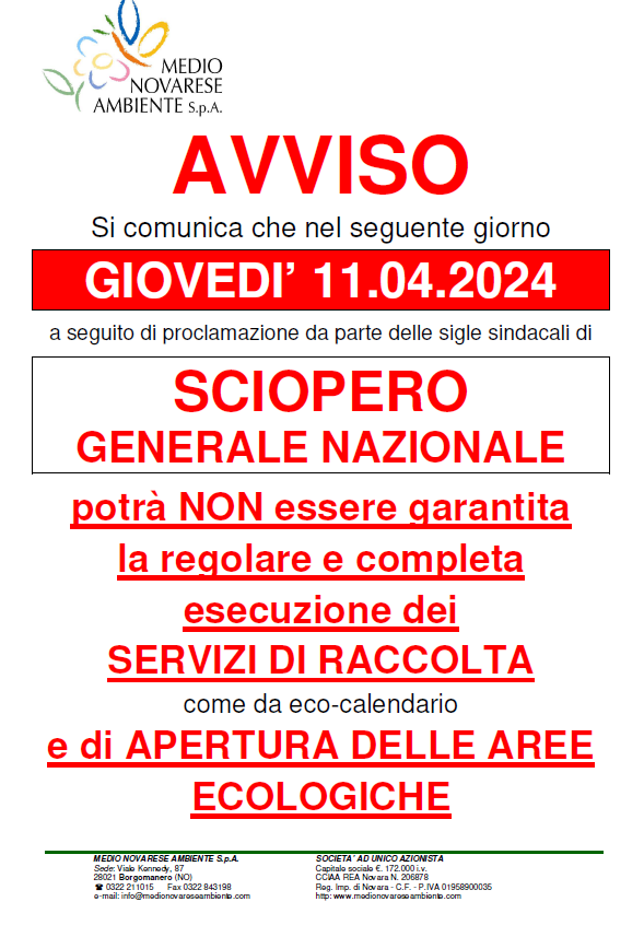 Si comunica che nel seguente giorno GIOVEDI’ 11.04.2024 a seguito di proclamazione da parte delle sigle sindacali di SCIOPERO GENERALE NAZIONALE potrà NON essere garantita la regolare e completa esecuzione dei SERVIZI DI RACCOLTA come da eco-calendario e di APERTURA DELLE AREE ECOLOGICHE