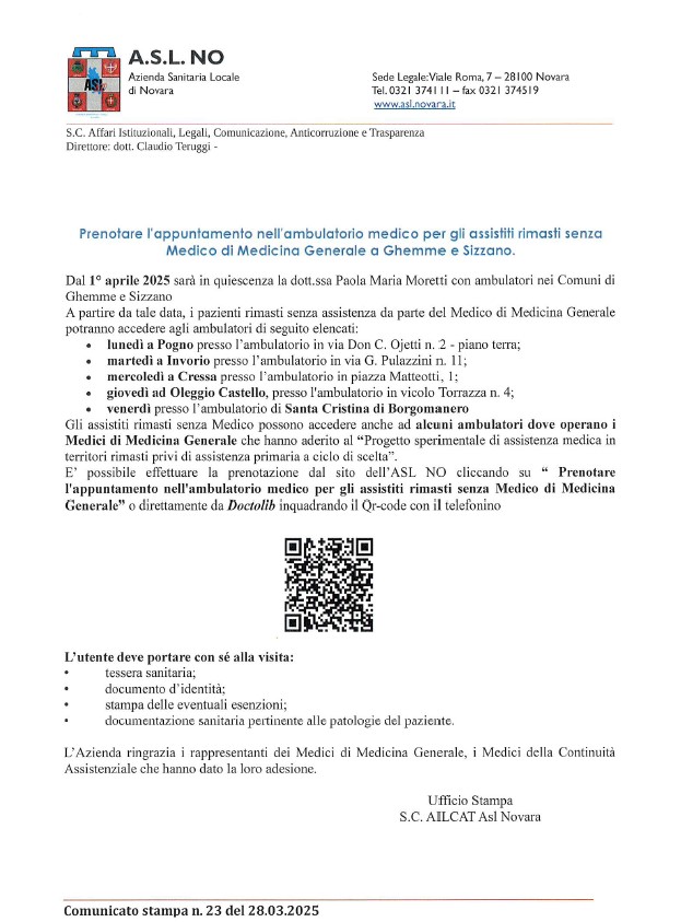 A partire da tale data, i pazienti rimasti senza assistenza da parte del Medico di Medicina Generale potranno accedere agli ambulatori di seguito elencati: